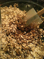 Mix everything but the oats in a big mixing bowl, stirring to emulsify the oil in the syrup. (see picture at the top of the page.)